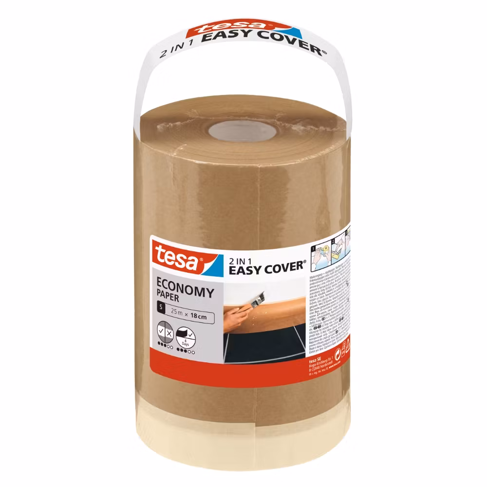 tesa Easy Cover Economy-papper är inte bara ett miljövänligt papper för målning. Det är också ett tidsbesparande hjälpmedel vid renovering och målning av ditt hem. Med kombinationen av ett slätt papper för maskering av stora ytor och en självhäftande maskeringstejp för enkel applicering kan du utföra två uppgifter i ett enda steg. Den självhäftande tejpen kan enkelt fästas på väggen eller någon annan yta. Den hjälper dig att få skarpa färgkanter under dina målningsarbeten. Pappret kan enkelt vecklas ut för att skydda golvet och möblerna mot eventuella färgstänk.