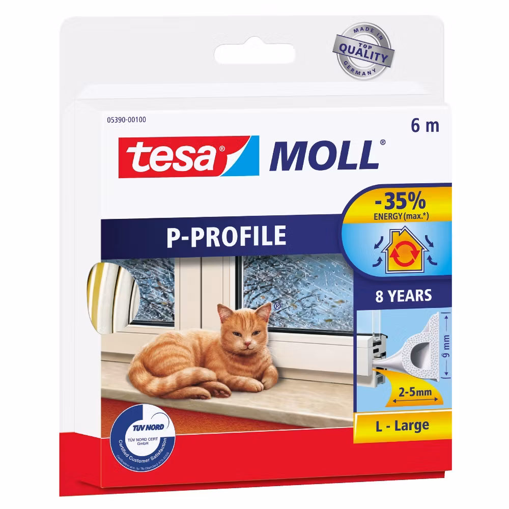 Tesamoll Tätningslist P-list i vit EPDM-gummi är en högkvalitativ lösning för lufttätning av fönster och dörrar med medelstora springor på 2–5 mm. Tillverkad av skummad EPDM-gummi, ger denna tätningslist ett långvarigt skydd mot drag och värmeförlust, med en hållbarhet på upp till 8 år. Den självhäftande baksidan gör appliceringen enkel och smidig, utan behov av ytterligare verktyg.